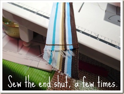 One you’ve sewn on your shelf liner, now stitch both layers of ribbon together, then sew the end shut.
