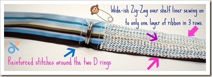 Now you’re going to sew on the shelf liner, but since we’re doing many rows of stitching to secure it sew through only one layer of the ribbon.